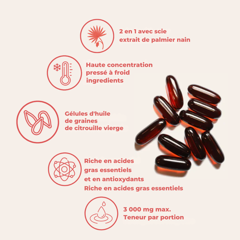 Récemment, plusieurs revendeurs douteux ont copié notre produit et vendent des gélules d’huile de pépins de courge diluées et de mauvaise qualité qui ne fonctionnent pas. Choisissez la formule authentique, pure et cliniquement prouvée — celle qui arrête réellement la chute des cheveux et stimule la repousse.