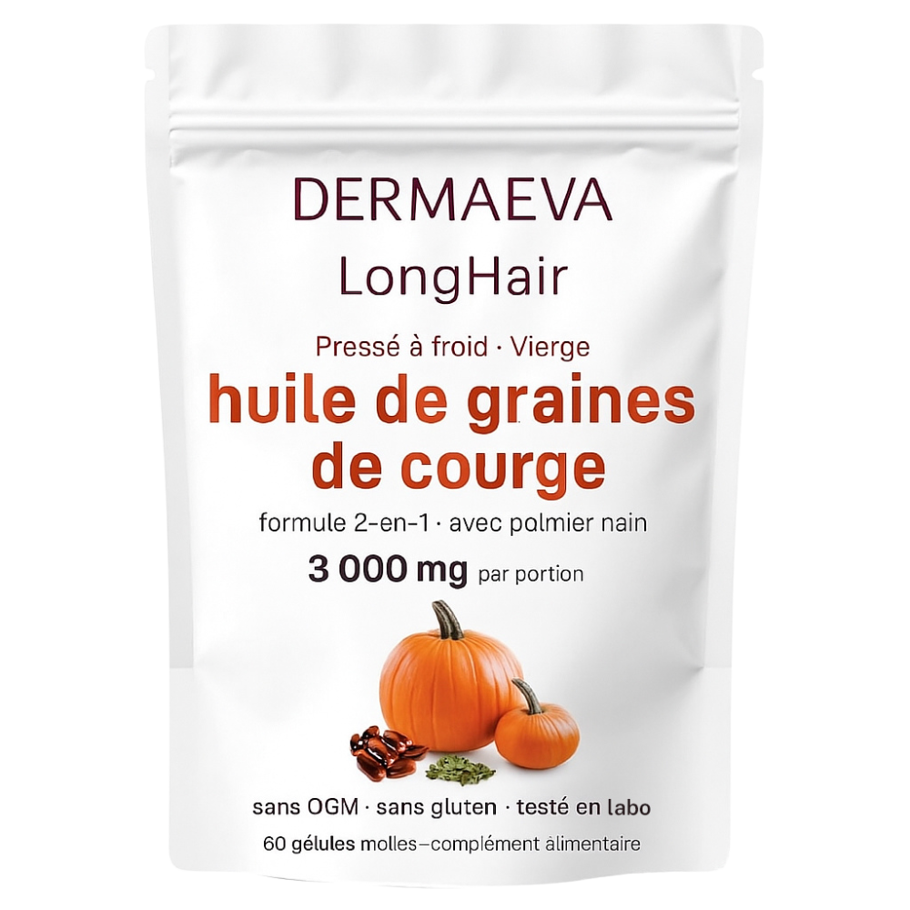 Nos capsules d’huile de pépins de courge 100% naturelle renforcent la fibre, aident à limiter la chute et favorisent une repousse plus dense.