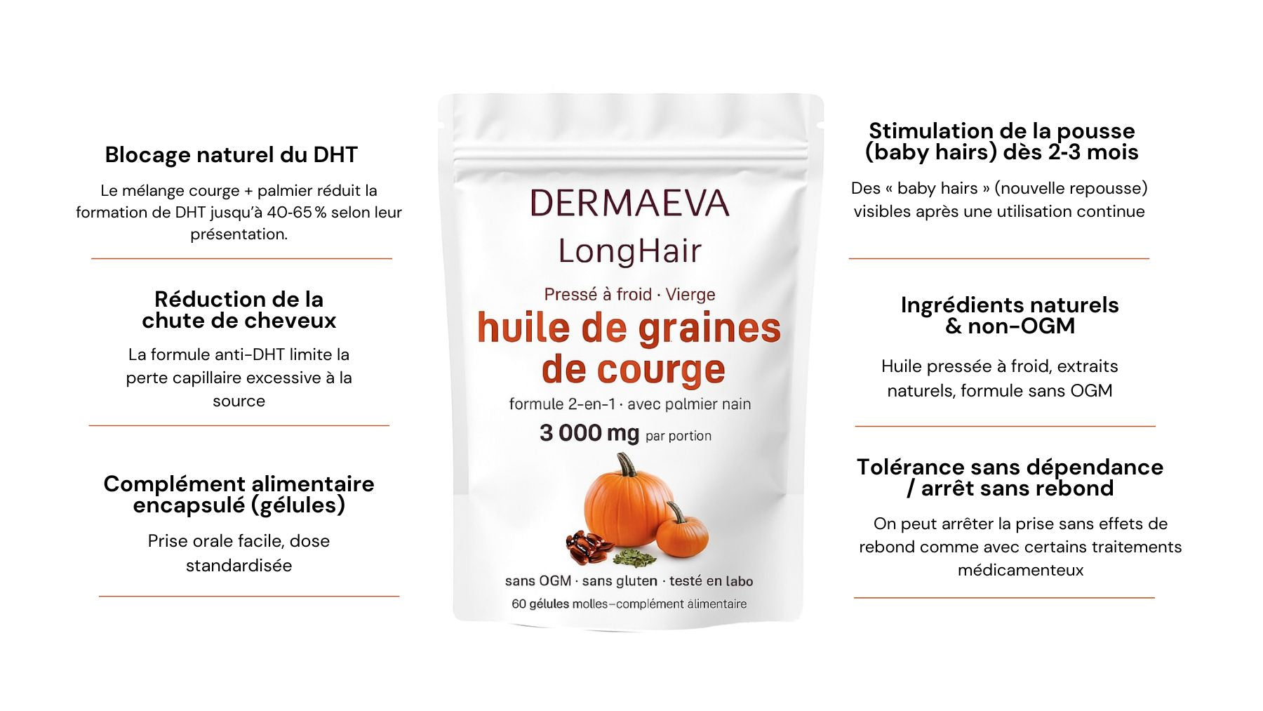 Non ! l'huile de graines de courge cible le cuir chevelu, là où les follicules pileux s'affinent à cause de la DHT. Elle ne provoque pas de repousse de poils aléatoire sur le visage ou le corps.