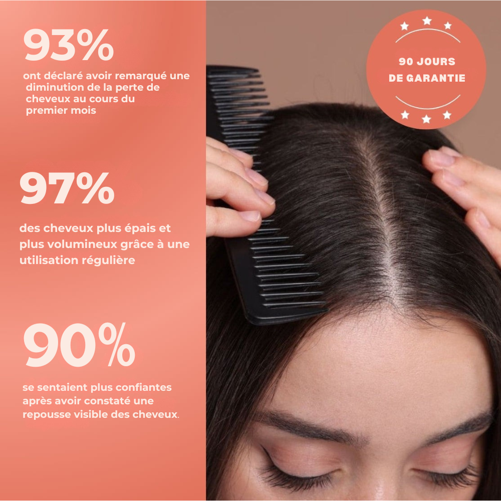 La plupart des personnes constatent une diminution de la chute des cheveux en 3 à 6 semaines, avec une repousse visible et des mèches plus épaisses vers 2 mois. La régularité est essentielle ! Les résultats s'améliorent avec la durée.